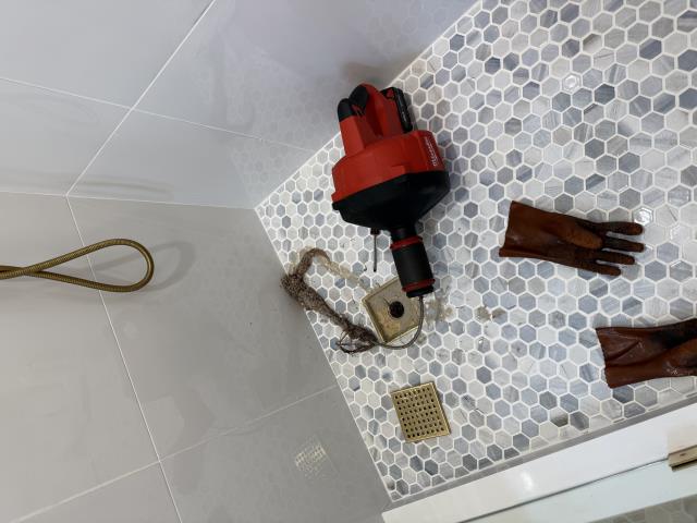 Shower drain clog removed after clearing a heavy buildup of hair and debris that was restricting flow. Drain was mechanically cleaned and tested to ensure proper drainage and normal operation was restored.