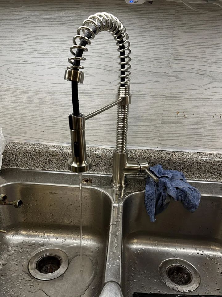 Work Performed: • Removed existing kitchen faucet and associated supply connections • Supplied and installed new commercial-style pull-down kitchen faucet • Connected hot and cold water supply lines and secured all mounting hardware • Tested faucet for proper operation including spray function and water flow • Checked for leaks and verified correct functionality • Cleaned up work area upon completion