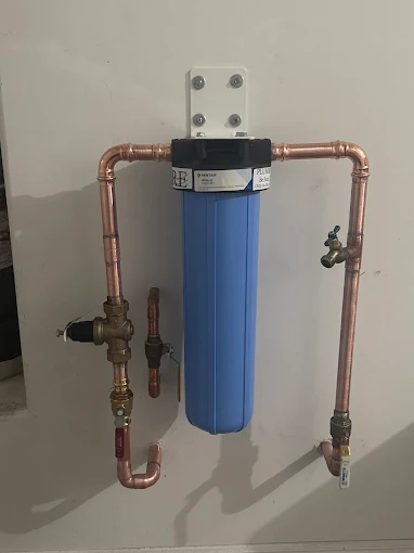 Work Performed: Installed new whole-house water filtration system with blue filter housing Cut into existing copper water line and reconfigured piping for proper system integration Installed new copper piping with fittings to create secure inlet and outlet connections Installed shut-off valves for isolation and future maintenance Mounted filtration system securely to wall with proper support bracket Installed hose bib connection for service and system flushing access Pressurized system and checked all connections for leaks Tested water flow through filtration system to ensure proper operation Cleaned up work area upon completion and removed all debris