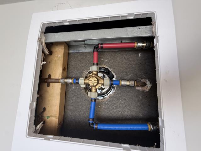 Work Performed: Opened wall access to expose existing shower valve and plumbing connections Removed existing shower valve assembly Supplied and installed new brass shower mixing valve body Connected new valve to existing hot and cold PEX water lines Installed new PEX fittings and couplings as required for proper connection Secured valve in proper position and alignment within wall cavity Reconnected outlet line to shower riser Pressurized system and tested valve for proper operation Verified hot and cold water supply functioning correctly with no leaks present Tested for proper operation and ensured no leaks present Cleaned up work area upon completion.