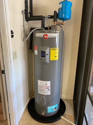 Work Performed: Supplied and professionally installed (1) new Rheem electric water heater Installed new thermal expansion tank for system protection Connected unit to existing hot and cold water lines with proper fittings Installed new shutoff valve for improved serviceability Secured electrical connections and verified proper voltage supply Installed drain pan and routed discharge line as required Ensured proper venting and clearances per manufacturer specifications Filled tank and properly purged air from system Tested for proper operation and ensured no leaks present Verified hot water delivery and thermostat functionality Cleaned up work area upon completion