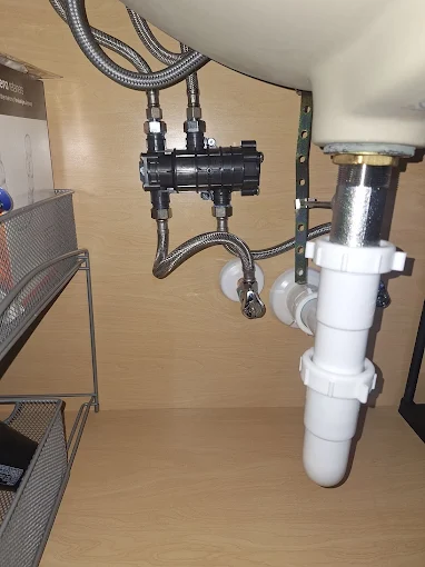 Work Performed: Installed new under-sink thermostatic mixing valve system Connected hot and cold water supply lines to mixing valve using braided stainless steel supply lines Configured tempered water outlet line for controlled temperature delivery Secured valve assembly to cabinet wall for stability and proper support Inspected existing P-trap and drain assembly for proper condition and alignment Turned on water supply and tested mixing valve for accurate temperature regulation Checked all supply connections for leaks and ensured watertight seals Verified proper flow and balanced temperature output at fixture Cleaned up work area upon completion and removed all debris